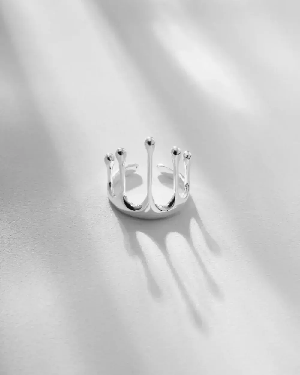 O Anel Chuva é uma criação contemporânea une delicadeza e escultura em um só gesto. Seu design orgânico exibe hastes finas que se erguem em delicados pontos arredondados, como gotas de chuva suspensas no tempo. Minimalista e refinado, desliza com conforto pelos dedos, revelando delicadeza e personalidade. Uma peça que une movimento e serenidade, perfeita para quem valoriza elegância sutil e expressão única.
