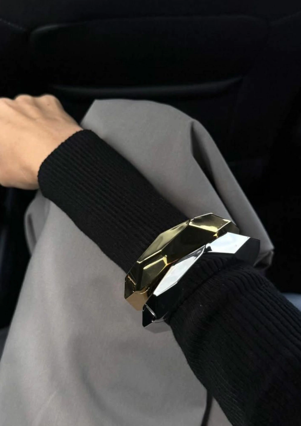 O poderoso bracelete facetado da nossa coleção transmite força e estabilidade, uma peça desenvolvida com sistema de molas que se adaptam a vários tamanhos de pulsos, sendo possível seu uso como pulseira e bracelete tipo três quartos. Seu brilho extremo é apresentado nos nossos banhos nobres em dourado e prata.